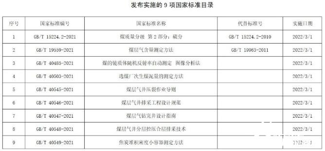 此次發(fā)布實施的煤炭領域國家標準中,《煤層氣含量測定方法》《煤層氣井壓裂作業(yè)導則》《煤層氣井排采工程設計規(guī)范》《煤層氣鉆完井設計指南》《煤層氣井分層控壓合層排采技術規(guī)范》等5項標準,將為我國低階煤煤層氣地質勘探與資源潛力評價和開發(fā)提供指導,優(yōu)化我國復雜地質條件地區(qū)煤層氣開發(fā)技術方案,推動煤層氣資源開采利用的最大化?!睹旱溺R質體隨機反射率自動測定 圖像分析法》《選煤廠次生煤泥量的測定方法》《焦炭堆積密度小容器測定方法》等3項方法標準,為煤炭資源評價、商品煤質量監(jiān)管等方面提供有力支撐。《煤炭質量分級 第2部分:硫分》對于科學評價煤炭資源中的硫分、指導煤炭生產和加工利用有著重要意義。