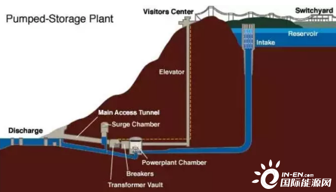 電網(wǎng)低谷時利用過剩電力將作為液態(tài)能量媒體的水從低標(biāo)高的水庫抽到高標(biāo)高的水庫,電網(wǎng)峰荷時高標(biāo)高水庫中的水回流到下水庫推動水輪機發(fā)電機發(fā)電。