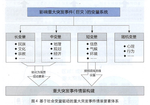 重大突發(fā)事件本身是一個復雜系統。當嘗試通過“情景構建”來表征重大突發(fā)事件的規(guī)律特點時,按照社會物理學理論,需要對一系列社會變量進行描述,決定重大突發(fā)事件情景的變量包含:長變量(與民族、文化、宗教相關的變量)、中變量(與地理、規(guī)劃、經濟、社會相關的變量)、短變量(與信息、氣候、環(huán)境、交通等相關的變量)、隨機變量(與心理、行為以及未知因素相關的變量)(見圖4)。為確保重大突發(fā)事件情景能夠準確地代表不斷演化的國家風險(或者地區(qū)風險),情景構建過程中,需將上面所述的長變量與中變量設置為情景恒定要素,當這兩類變量發(fā)生變動時,需要及時修訂情景;此外,關于短變量,應該基于“底線思維”,設置可能導致事件往最壞方向發(fā)展的變量,這樣可以有效保證與情景所匹配的目標能力具備“冗余”。而隨機變量,對于情景構建來說不具備較大價值,不應該在情景中描述。