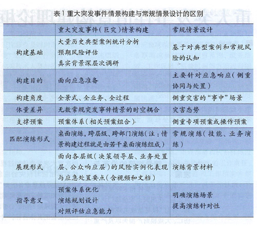 在傳統應急管理中,實戰(zhàn)演練之前往往開展情景設計,常規(guī)情景設計與重大突發(fā)事件情景構建無論在研究體量、研究目的,還是研究意義都存在著一定的差異,如表1所示。