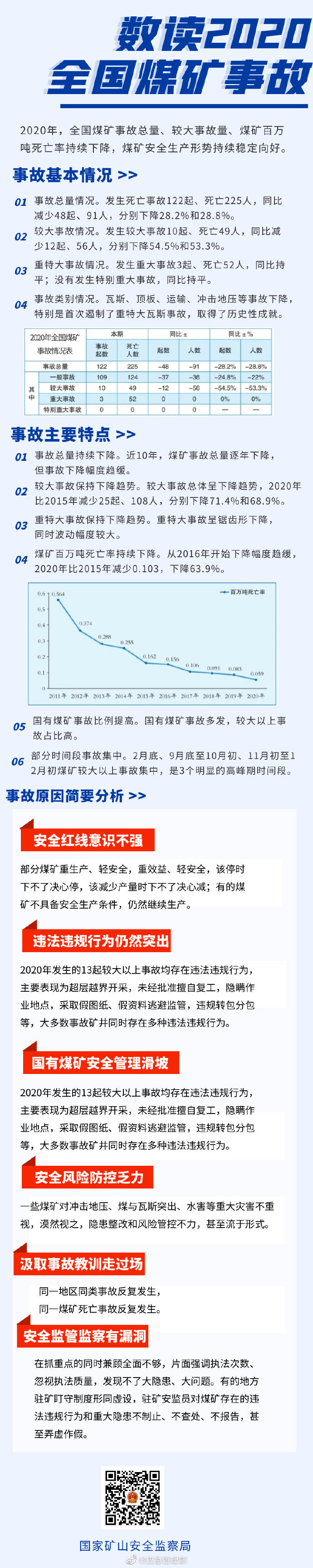 2020年,面對(duì)極其嚴(yán)峻復(fù)雜的國(guó)內(nèi)外形勢(shì),特別是新冠肺炎疫情的嚴(yán)重沖擊,在黨中央、國(guó)務(wù)院的堅(jiān)強(qiáng)領(lǐng)導(dǎo)下,各地區(qū)、各有關(guān)部門(mén)和廣大煤礦企業(yè)統(tǒng)籌抓好疫情防控和安全生產(chǎn)工作,全國(guó)煤礦事故總量、較大事故量、煤礦百萬(wàn)噸死亡率持續(xù)下降,煤礦安全生產(chǎn)形勢(shì)持續(xù)穩(wěn)定向好。
