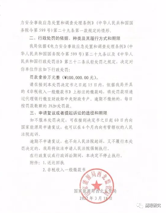 3月18日,國家能源局西北監(jiān)管局發(fā)布對陜西靖邊明陽新能源發(fā)電有限公司的行政處罰決定書(西北監(jiān)能罰決字〔2022〕5號),該公司因?qū)θ毕菰O(shè)備檢查不嚴(yán)格造成風(fēng)機(jī)墜落一般生產(chǎn)安全事故,且漏報事故信息,對其作出罰款10萬元的決定。