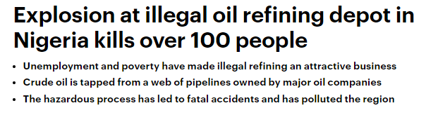 非法原油煉制產(chǎn)業(yè)有著致命后果,這些原油通常都是從大型石油業(yè)者們縱橫交錯(cuò)的管線接取, 在簡陋儲(chǔ)槽煉制成油品. 程序復(fù)雜而危險(xiǎn), 已經(jīng)造成了許多致命意外事故,。