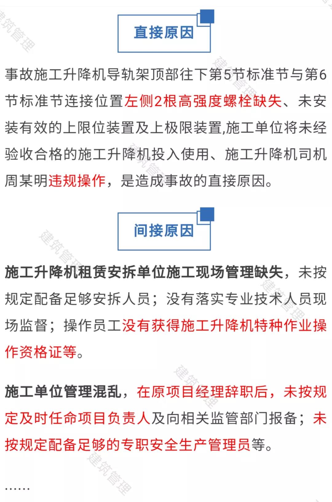 2.廣東龍越建筑工程有限公司(施工單位)。作為項目工程的承建單位,管理混亂,在原項目經(jīng)理潘永兵辭職后,未按規(guī)定及時任命項目負責人及向相關(guān)監(jiān)管部門報備;未按規(guī)定配備足夠的專職安全生產(chǎn)管理員;未督促落實專職設(shè)備管理人員張小龍、專職安全生產(chǎn)管理員吳俊霖按規(guī)定對施工升降機頂升加節(jié)進行現(xiàn)場監(jiān)督檢查;未按規(guī)定組織安拆、監(jiān)理等有關(guān)單位對施工升降機頂升加節(jié)操作后進行驗收及出具驗收記錄,就違規(guī)投入使用。