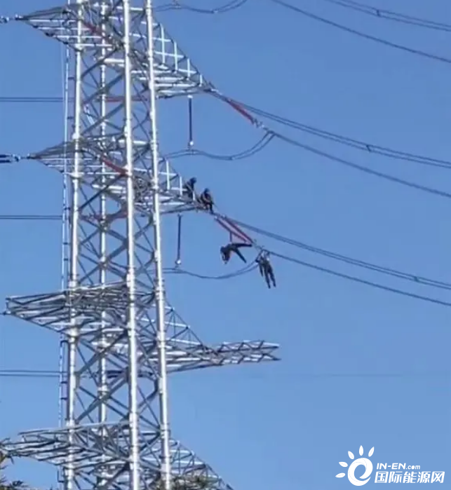 網(wǎng)友拍攝的視頻內(nèi)容顯示,在一道路附近的高壓線桿上,兩名人員的身體懸掛在線纜上一動(dòng)不動(dòng),疑似發(fā)生觸電事故,一旁則是架設(shè)的高壓電力設(shè)施。極目新聞?dòng)浾咦⒁獾剑瑑擅藛T身穿黑色衣服,頭戴安全帽,因事發(fā)地位于道路交叉口,附近來(lái)往行人和車(chē)輛較多,不時(shí)有市民在一旁圍觀。