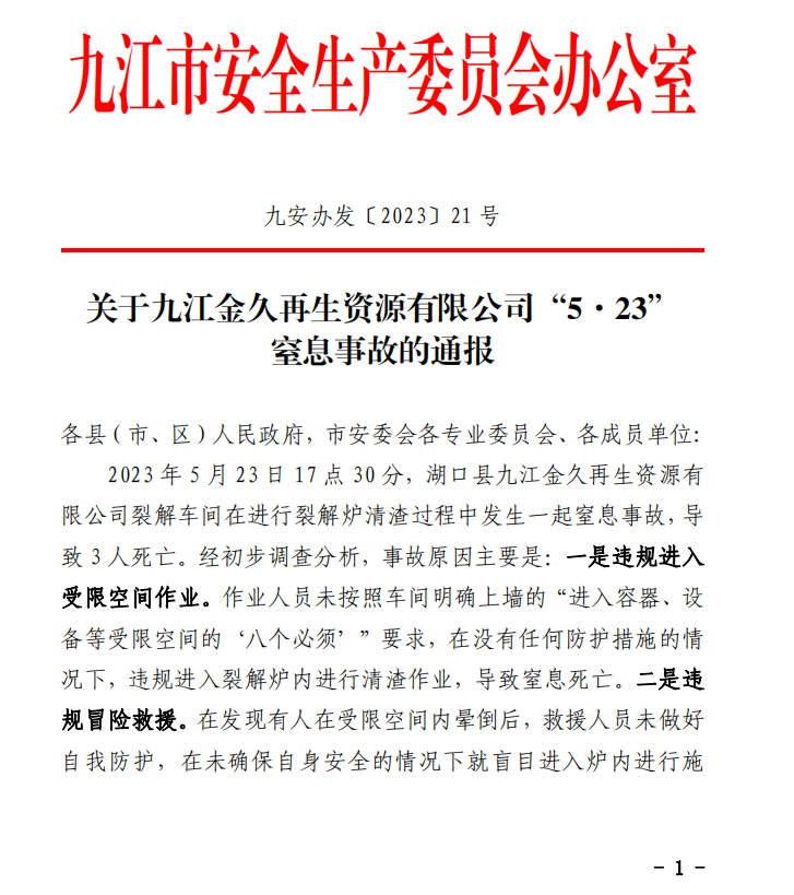 湖口縣九江金久再生資源有限公司裂解車間在進行裂解爐清渣過程中發(fā)生一起窒息事故