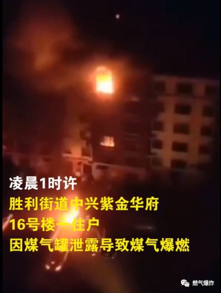 2019年9月4日0時53分,吉林樺甸市勝利街道中興紫金華府16號樓一住戶因煤氣罐泄漏導致煤氣爆燃,造成1人當場死亡,無其他人員受傷。火災于9月4日1時30分撲滅,經(jīng)查,房屋過火面積50平方米,損毀私家車2輛,煤氣爆燃具體原因相關部門正在進一步調查中。