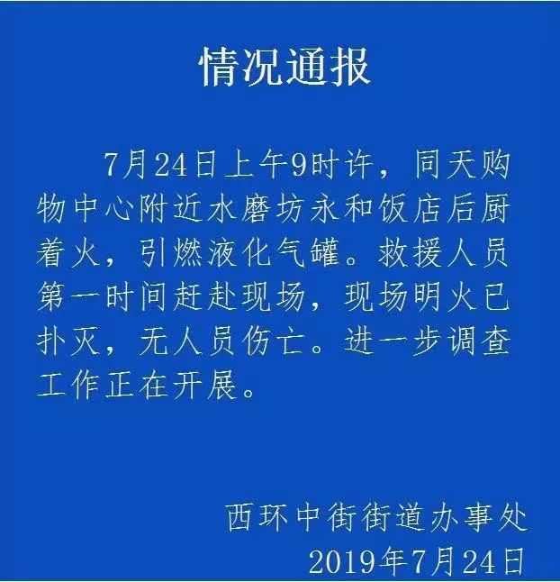 7月24日上午9時(shí)許,同天購(gòu)物中心附近水磨坊永和飯店后廚著火,引燃液化氣罐。救援人員第一時(shí)間趕赴現(xiàn)場(chǎng),現(xiàn)場(chǎng)明火已撲滅,無(wú)人員傷亡。進(jìn)一步調(diào)查工作正在開展。