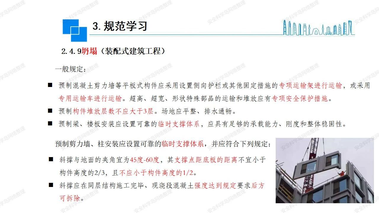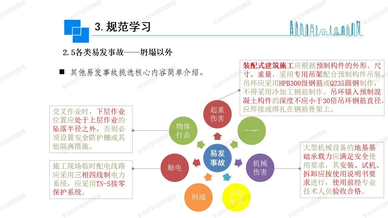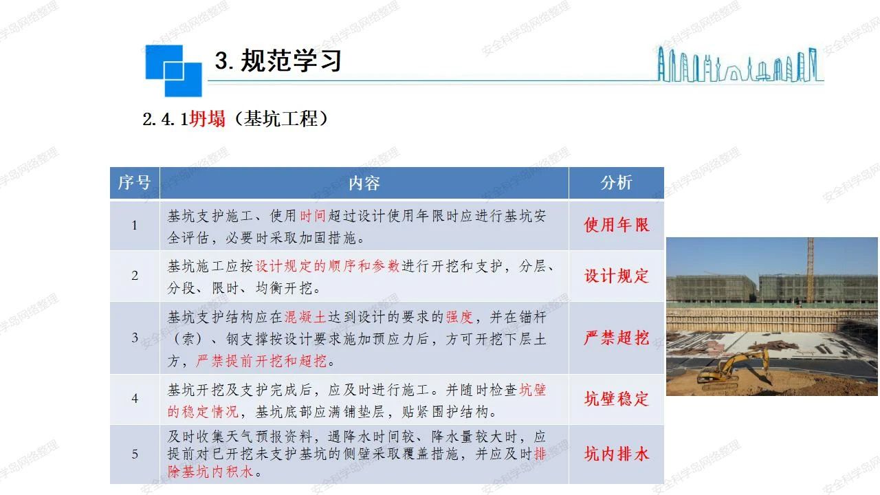 那么,坍塌事故發(fā)生的原因何在? (1)工程結(jié)構(gòu)設(shè)計(jì)不合理或計(jì)算失誤。 (2)施工前沒有編制切實(shí)可行的施工組織設(shè)計(jì)和專項(xiàng)施工方案,未做具體技術(shù)安全措施交底,特定施工項(xiàng)目未經(jīng)專家評(píng)審論證。 (3)腳手架、模板支撐、起重設(shè)備結(jié)構(gòu)設(shè)計(jì)不合理或計(jì)算失誤。 (4)建筑物結(jié)構(gòu)質(zhì)量低劣,安全性能差,地基不穩(wěn)定,不均勻沉降。 (5)建筑物結(jié)構(gòu)支撐連接(焊接)不牢固,超載、外力沖擊或嚴(yán)重偏心載荷造成失穩(wěn)等。 (6)腳手架及高大模板支架架體結(jié)構(gòu)不符合設(shè)計(jì)與規(guī)范要求,整體安全穩(wěn)定性差、超載或嚴(yán)重偏心荷載,遇外力沖擊或振動(dòng),不按程序拆除架體等因素造成失穩(wěn)等。 (7)基坑、土石方挖土?xí)r土壁不按規(guī)定留設(shè)邊坡(甚至負(fù)坡度),缺乏支護(hù)或支護(hù)不良,土質(zhì)不良或出現(xiàn)地下水、地表水的滲透,土壁經(jīng)不起重載側(cè)壓力或遇外力振動(dòng)、沖擊等因素造成土壁失穩(wěn)滑坡坍塌。 (8)起重設(shè)備技術(shù)安全性能差,結(jié)構(gòu)強(qiáng)度不夠,安全防護(hù)裝置不完善,垂直起重機(jī)與建筑物拉結(jié)差,出現(xiàn)超載、碰撞、升降過度或違章操作等原因,造成起重設(shè)備倒塌。 (9)現(xiàn)場作業(yè)環(huán)境不良,安全防護(hù)設(shè)施缺乏。 (10)施工現(xiàn)場管理松弛,各項(xiàng)質(zhì)量、安全管理制度流于形式。 (11)片面追求經(jīng)濟(jì)利益,偷工減料,施工質(zhì)量差。 (12)施工隊(duì)伍素質(zhì)差,不執(zhí)行法規(guī)、標(biāo)準(zhǔn),違章指揮、違章作業(yè),思想上存在盲目性、冒險(xiǎn)性、隨意性。 如何預(yù)防坍塌事故? (1)根據(jù)設(shè)計(jì)與規(guī)范要求,認(rèn)真編制施工組織設(shè)計(jì)和專項(xiàng)施工技術(shù)方案、應(yīng)急預(yù)案,做好特定施工項(xiàng)目專家評(píng)審論證及技術(shù)安全交底工作。 (2)支架、腳手架等搭設(shè)完成后應(yīng)組織相關(guān)部門驗(yàn)收。支架還應(yīng)按方案要求進(jìn)行堆載預(yù)壓。 (3)嚴(yán)格控制模板支架、腳手架等承受的荷載,模板、腳手架及其支撐體系的施工荷載應(yīng)做到均勻分布,并不得超過設(shè)計(jì)要求。嚴(yán)禁超載、對(duì)構(gòu)筑物進(jìn)行外力沖擊或偏心載荷。 (4)基坑、土石方挖土?xí)r土壁按規(guī)定留設(shè)邊坡,嚴(yán)格按照設(shè)計(jì)坡度進(jìn)行放坡開挖,進(jìn)行有效支護(hù)和排水,并設(shè)置專人對(duì)邊坡穩(wěn)定性進(jìn)行檢測?;討?yīng)基坑頂邊緣1m范圍內(nèi)禁止堆放材料。 (5)加強(qiáng)起重設(shè)備的采購管理,嚴(yán)禁使用不合格的起重設(shè)備,并定期進(jìn)行檢測,確保各項(xiàng)性能和安全防護(hù)裝置良好;加強(qiáng)起重設(shè)備的安裝、拆除管理;加強(qiáng)起重設(shè)備的使用管理,嚴(yán)禁超載、碰撞或違章操作;加強(qiáng)對(duì)起重設(shè)備操作人員、指揮人員、安拆人員的安全教育培訓(xùn),考核合格后持證上崗。 (6)加強(qiáng)施工現(xiàn)場管理,設(shè)置有效安全防護(hù)設(shè)施。 (7)加強(qiáng)對(duì)從業(yè)人員的培訓(xùn)教育,提高隊(duì)伍素質(zhì),強(qiáng)化質(zhì)量、安全意識(shí)。 (8)強(qiáng)化工程質(zhì)量報(bào)驗(yàn)和檢驗(yàn)、簽證制度,不經(jīng)檢驗(yàn)合格,不準(zhǔn)進(jìn)行下道工序施工。 (9)發(fā)現(xiàn)坍塌事故的險(xiǎn)情,要認(rèn)真分析原因,積極研究提出排除隱患的整改措施,并監(jiān)督執(zhí)行。