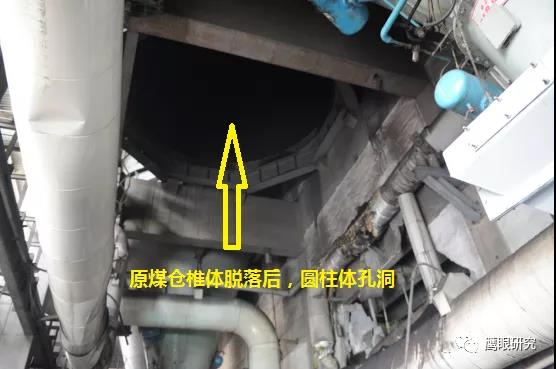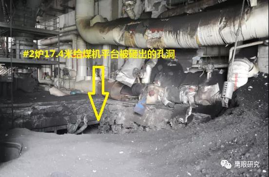 現(xiàn)場檢查,#2爐2D原煤倉下部錐體部脫落,砸壞2D給煤機平臺,連同給煤機墜落至#2鍋爐零米,2D給煤機損壞、2C、2D磨煤機油站、2D磨煤機、給煤機附近區(qū)域電纜、輔汽聯(lián)箱管道等設(shè)備不同程度受損,無人員傷害及主設(shè)備損壞。(堵煤次數(shù)太多,敲塌了?)