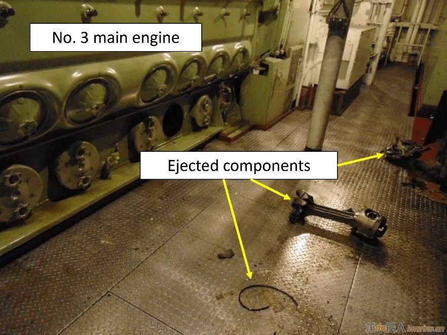 在煙霧開始消散,主機周邊降溫后,船員認為沒有必要使用消防水槍或二氧化碳消防系統(tǒng)。在“Wenatchee”號安全抵達泊位后,工程師再次進入機艙,并發(fā)現(xiàn)三號發(fā)動機旁邊散落的一些破損部件,包括連桿和一部分活塞。