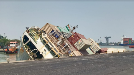 加爾各答港口官員報告說,這艘船于3月22日從印度薩加爾港抵達(dá)加爾各答,在3月24日上午剛剛完成裝載,總共裝載了165 個集裝箱,包括120個 20 英尺集裝箱和45 個 40英尺集裝箱。該船原定于今天啟程前往孟加拉國吉大港,然而突然在沒有任何征兆的情況下發(fā)生傾斜,并在15分鐘內(nèi)側(cè)翻和部分沉沒,導(dǎo)致集裝箱掉入港口。