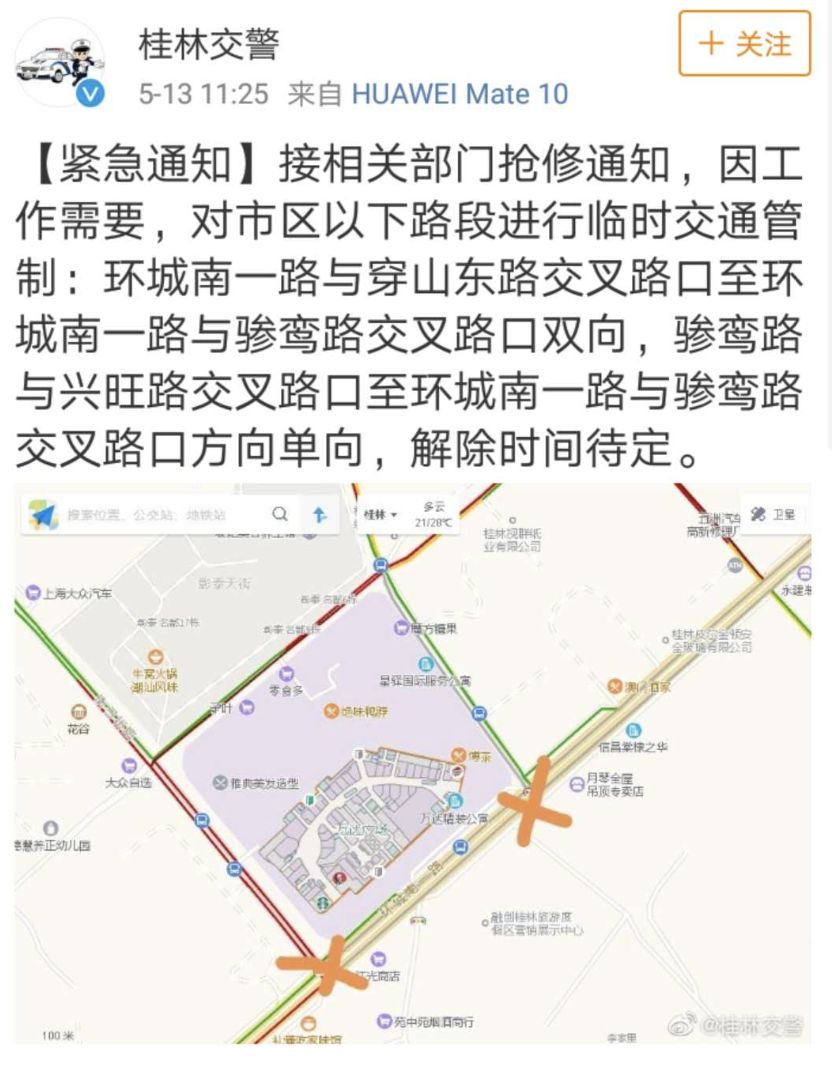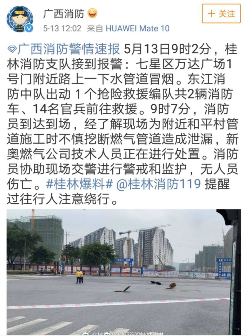 中午12時,@廣西消防官微發(fā)布了一警情速報:5月13日9時2分,桂林消防支隊接到報警:七星區(qū)萬達廣場1號門附近路上一下水管道冒煙。9時7分,消防員到達到場,經(jīng)了解現(xiàn)場為附近和平村管道施工時不慎挖斷燃氣管道造成泄漏,新奧燃氣公司技術人員正在進行處置。消防員協(xié)助現(xiàn)場交警進行警戒和監(jiān)護,無人員傷亡。