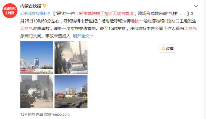 3月25日13時(shí)50分左右,呼和浩特市新世紀(jì)廣場(chǎng)附近呼和浩特地鐵一號(hào)線博物館(舊)站口工地發(fā)生天然氣泄漏事故,該處一度實(shí)施交通管制。